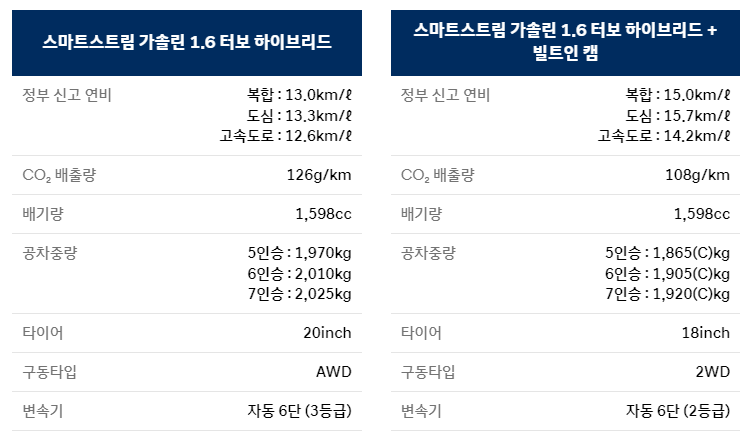 - 2WD 18인치 휠 + 빌트인캠 모델: 복합 15.0km/L (도심 15.7km/L, 고속도로 14.2km/L)