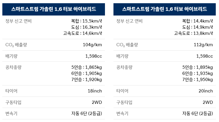 - 2WD 18인치 휠 모델: 복합 15.5km/L (도심 16.3km/L, 고속도로 14.6km/L)
