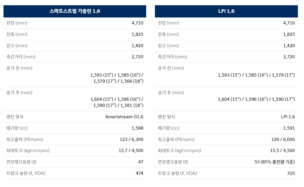 - LPi 1.6 15인치 휠 모델: 복합연비 10.5km/ℓ (도심 9.3km/ℓ, 고속도로 12.4km/ℓ)