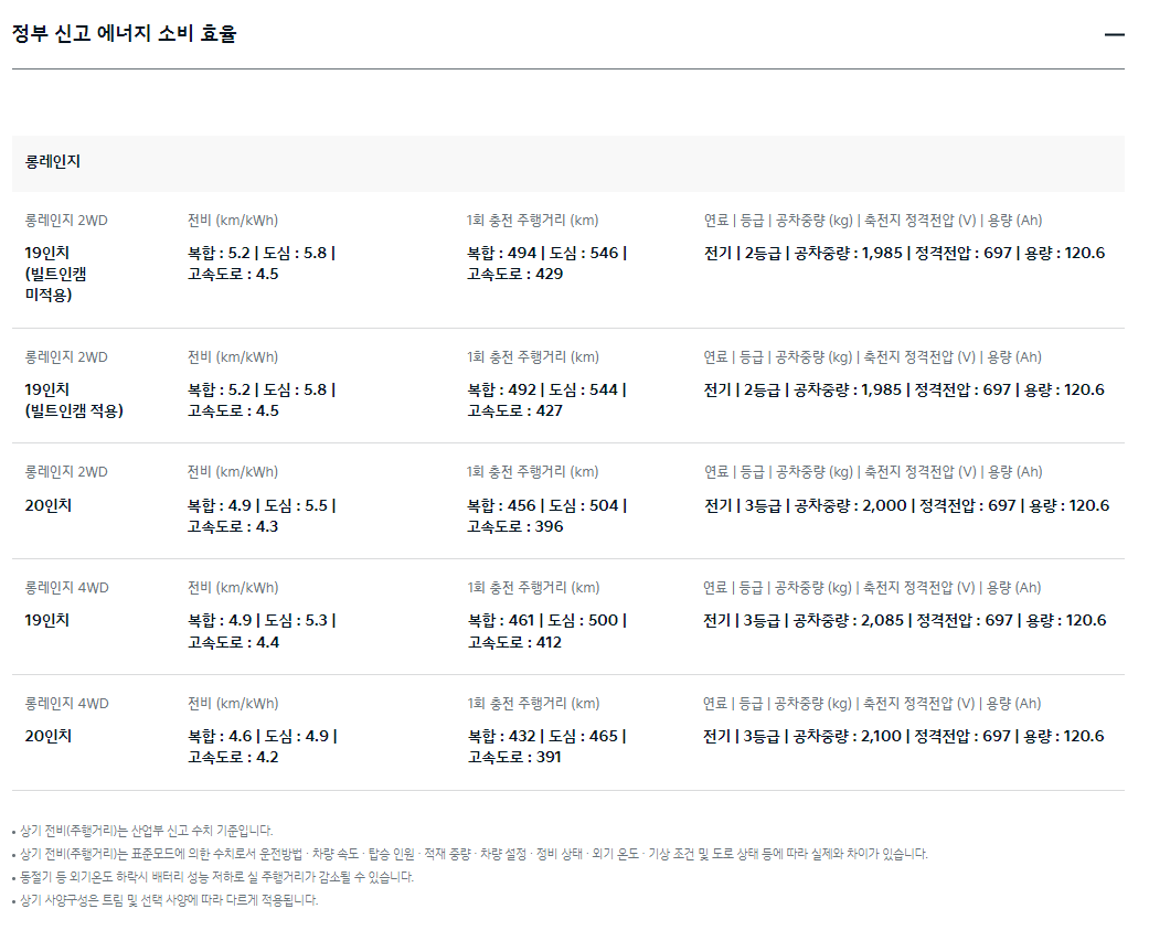 - 1회 충전 주행거리 (롱레인지 2WD 19인치 기준):