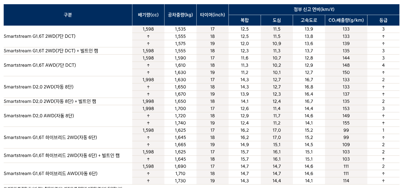 가솔린 1.6 터보 모델의 경우, 복합연비 11.5km/L를 기록합니다.