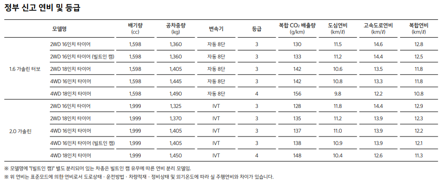 1.6 터보 모델의 경우, 2WD 기준으로 복합연비 12.7km/L를 기록합니다.