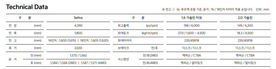 이러한 제원은 기아 셀토스가 실용성과 스타일을 동시에 추구하는 소비자들에게 적합한 선택임을 보여줍니다.