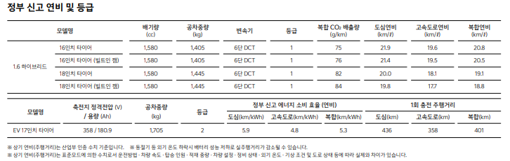 하이브리드 모델의 경우, 16인치 휠 기준으로 복합연비 20.8km/L를 기록하고 있습니다.
