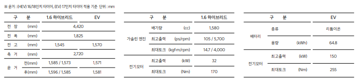 하이브리드 모델은 1.6리터 가솔린 엔진과 전기모터의 조합으로 구성되어 있습니다.