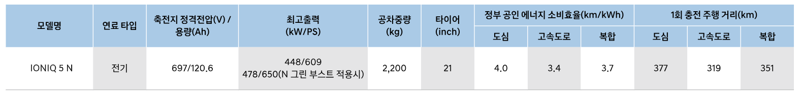 아이오닉5 N의 공인 연비는 다음과 같습니다: