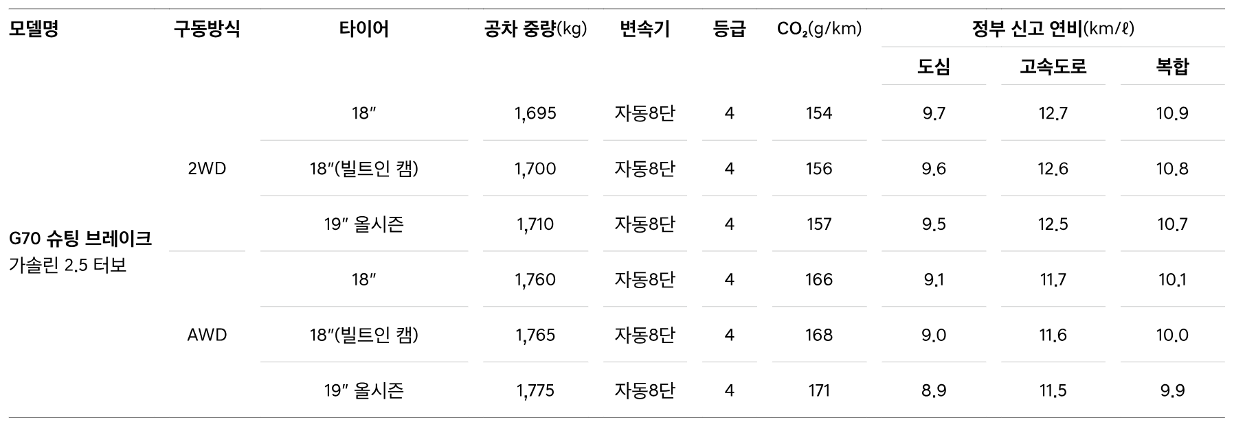 - 가솔린 2.5 터보 AWD: 복합 10.5km/L (도심 9.4km/L, 고속도로 12.2km/L)