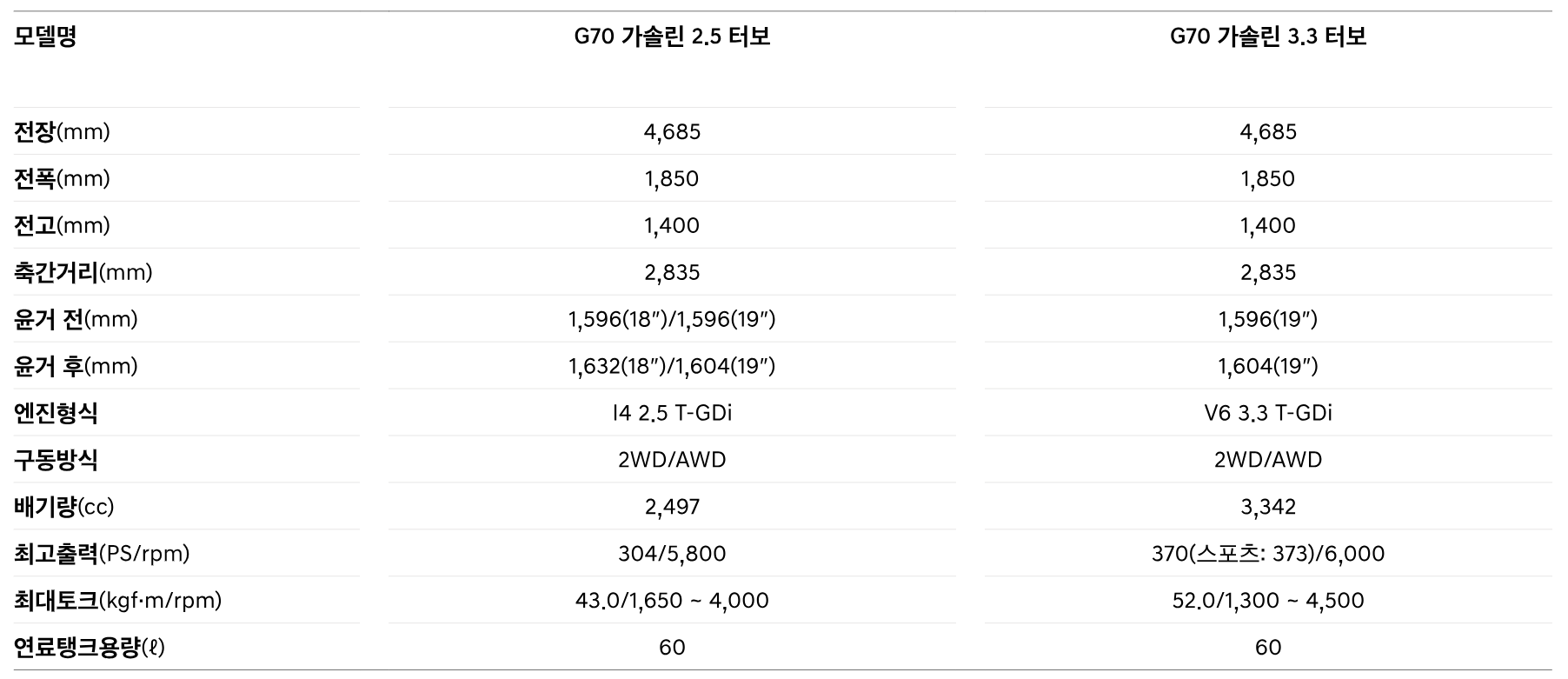 G70는 다양한 파워트레인 옵션을 제공합니다:
