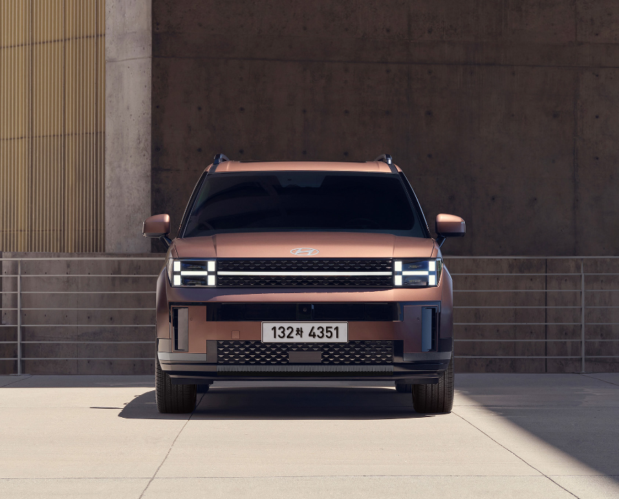 현대 싼타페는 최신 디자인 언어를 적용하여 더욱 세련되고 현대적인 외관을 자랑합니다. 특히 대형 그릴과 특징적인 LED 헤드라이트는 현대의 새로운 디자인 정체성을 잘 보여줍니다.